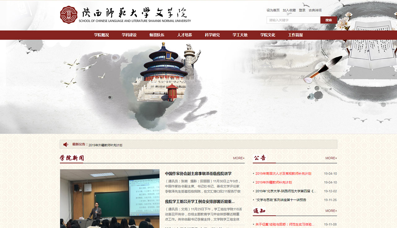 陜西師范大學文學院的前身是1944年成立的陜西省立師范專科學校國文科。1949年西安解放后,師專并入西北大學,成立西北大學師范學院,國文科改為國文系。1953年國文系改稱為*語言文學系(中文系)。次年,西北大學師范學院獨立為西安師范學院。1960年西安師院與陜西師院合并為陜西師范大學,中文系的事業有了新的發展。1977年后,隨著*高考制度的恢復和*,高等教育走上了健康發展的道路,中文系的面貌也煥然一新。
