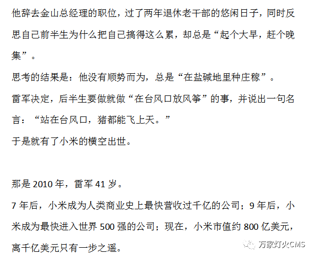 雷軍35歲雖然已經(jīng)是金山總經(jīng)理和卓越董事長,但是做得又累又焦慮又迷茫,直到41歲創(chuàng)立小米,才開始一飛沖天;