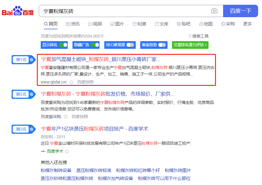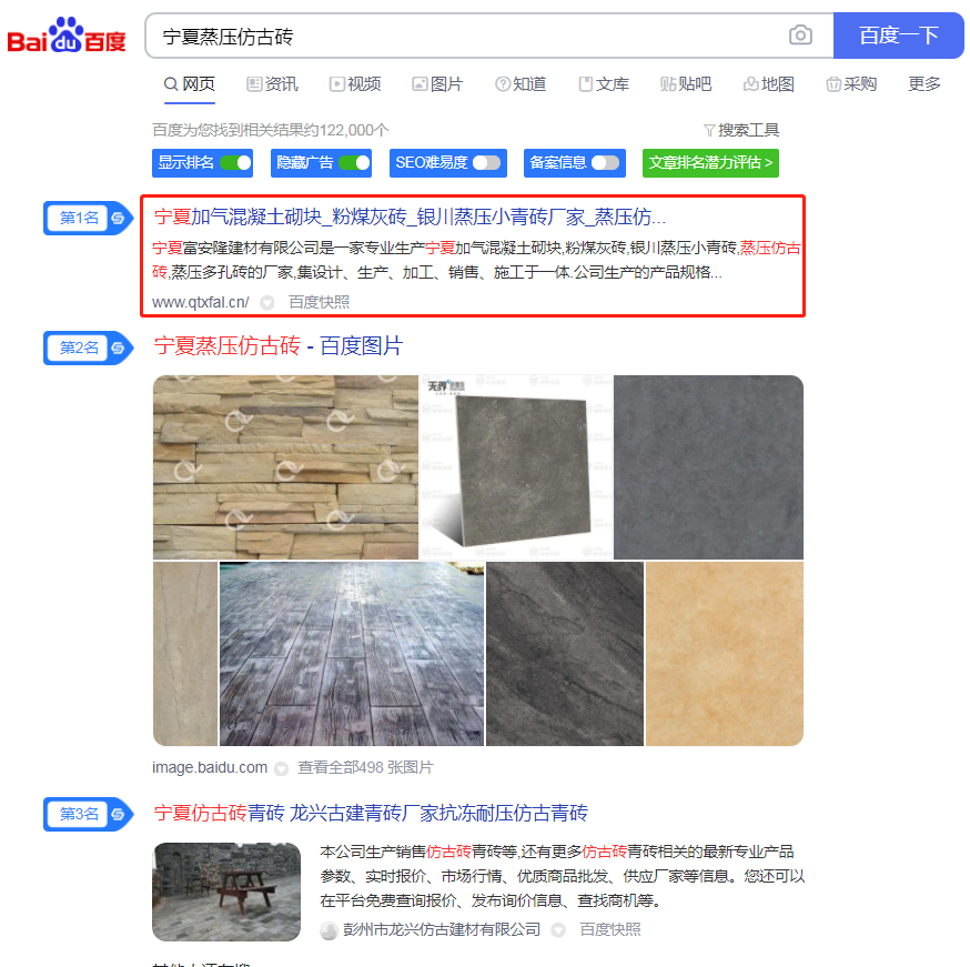 富安隆建材網(wǎng)站上線后,僅用了10天的時間,就被百度收錄,關(guān)鍵詞:寧夏蒸壓粉煤灰磚、寧夏粉煤灰磚、寧夏蒸壓仿古磚均占據(jù)首頁*名。此外,富安隆建材網(wǎng)站的到訪率和詢盤量正在持續(xù)上升中,相信很快就能迎來成交。