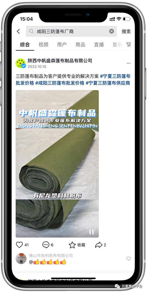 >>>視頻:策劃剪輯發(fā)布多條視頻,咸陽三防篷布廠商、陜西三防篷布生產(chǎn)等關(guān)鍵詞均在抖音搜索前列展現(xiàn)。